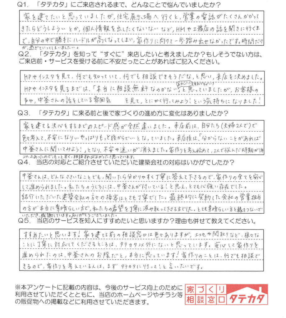 家を建てる決心をするまでのスピード感が全然違いました。来店前は、自分たち(夫婦2人で)で 色々考えて、不安になり、、やっぱりもっと後からで…となっていました。来店後は「分からないことがあれば 中釜さんに聞いてみよう!」となり、不安や迷いが消えました。家作りを考え始めて、2人で悩んだ時期が1年以上あったので、もっと早く、相談すればよかったと思っています。